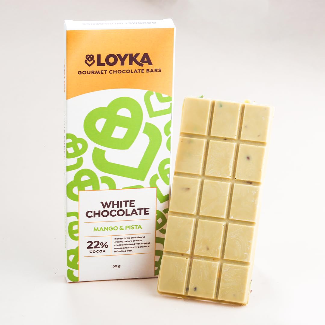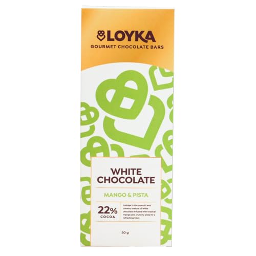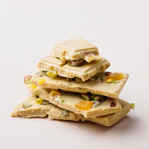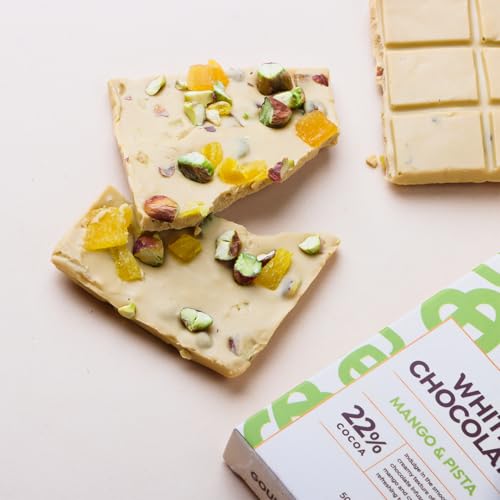 Experience a delightful fusion of 22% cocoa white chocolate tropical mango and crunchy pistachios (10%) creating a unique and refreshing chocolate experience. This smooth and creamy treat melts effortlessly in your mouth offering a perfect balance of fruity sweetness and nutty crunch. The exotic mango flavor pairs beautifully with the rich pistachios making every bite an indulgent delight. Whether you're looking for a luxurious personal treat a unique gift or a shareable snack this 50g pack is perfect for every occasion. With a 6-month shelf life it stays fresh and delicious for longer. For the best taste and texture refrigerate before consumption and store below 18°C in a cool dry place away from direct sunlight. Elevate your chocolate cravings with this one-of-a-kind mango-pistachio delight!