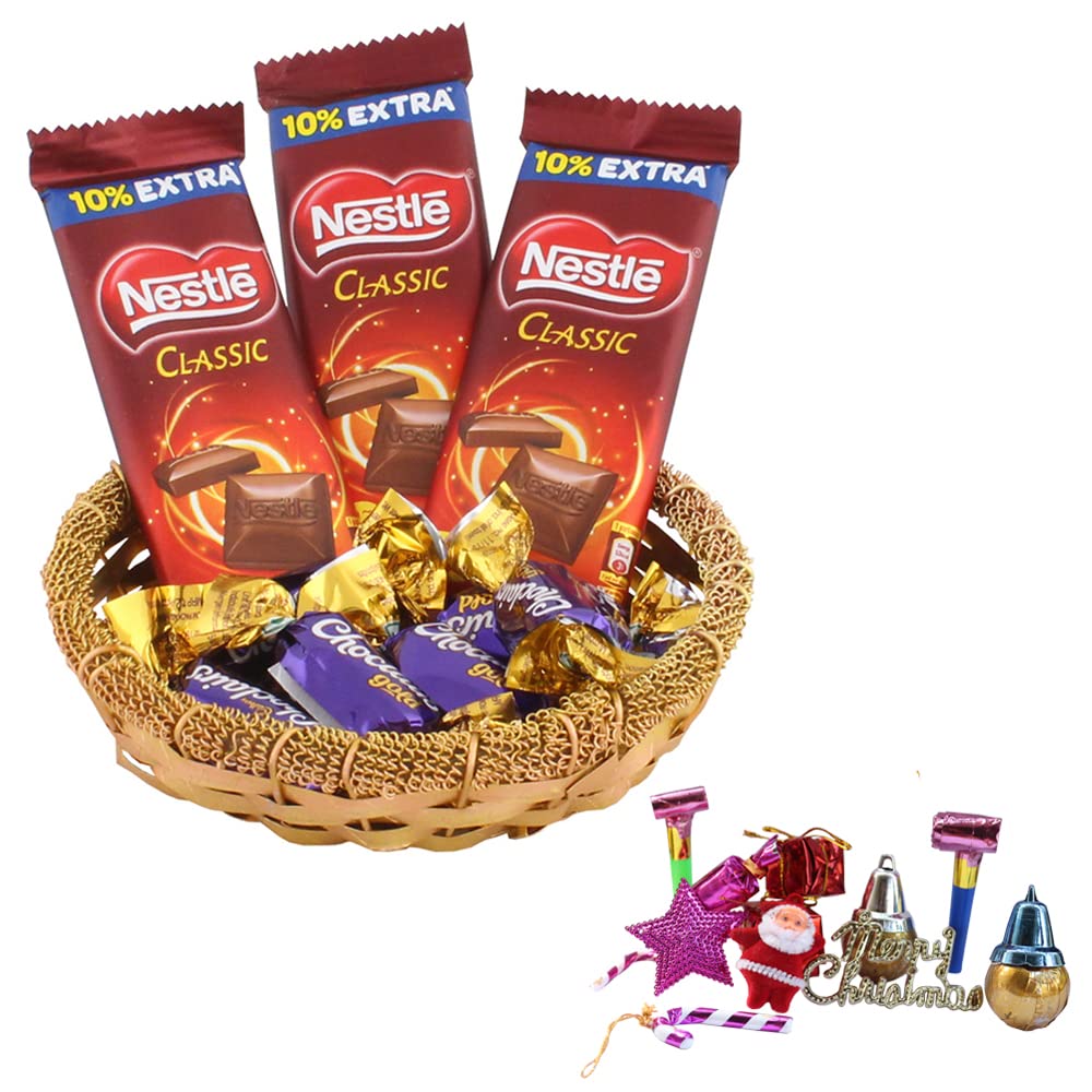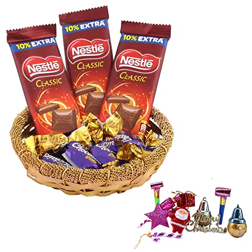 You don't need to wait for the right time to share your happiness you can share it with your loved ones anytime anywhere. we sometimes forget to savor the little moments of pleasure and share these joyful moments with others. We believe that chocolates are the best way to share and spread joy around.If you are a Chocolate lover there cannot be a better treat for you than this wonderful Hamper. Assorted Chocolates such a yummy treat that can easily delight a dear one. This is an absolute bundle of joy. This Hamper Includes: 1 Golden Katory 3 Nestle Classic 5 Choclairs
