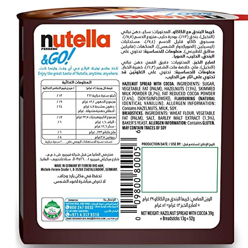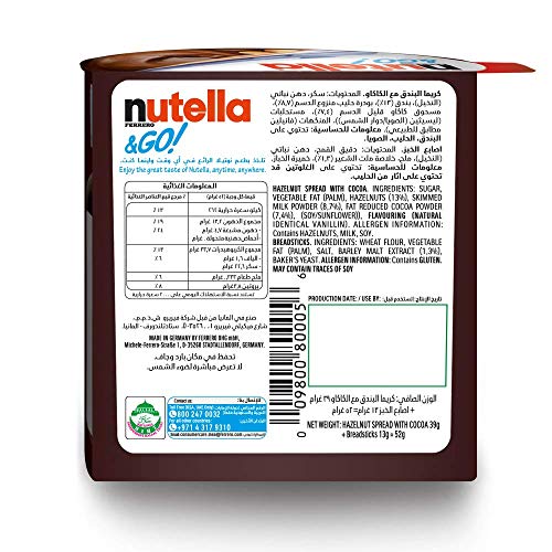 Available in a single serve pack Perfect for when you're on the go Nutella & go! Comes with delicious Nutella choc-hazelnut spread and crispy breadsticks perfect for dipping.