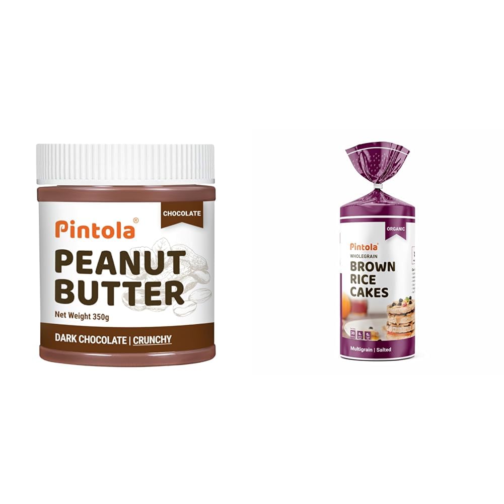 Pintola Combo - Chocolate Peanut Butter Crunchy 350g + Rice Cake Multigrain Salted 130g, 100% Pure Roasted Peanuts butter Chocolate Flavour Crunchy, High Fibre With Organic Rice Cakes