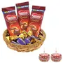You don't need to wait for the right time to share your happiness you can share it with your loved ones anytime anywhere. we sometimes forget to savor the little moments of pleasure and share these joyful moments with others. We believe that chocolates are the best way to share and spread joy around.If you are a chocolate lover there cannot be a better treat for you than this wonderful Hamper.such a yummy treat that can easily delight a dear one. This is an absolute bundle of joy. This Hamper Includes: 1 Golden Katory 3 Nestle Classic 5 ChoclairsDiwali Designer Diya 2 Pieces Set.