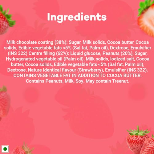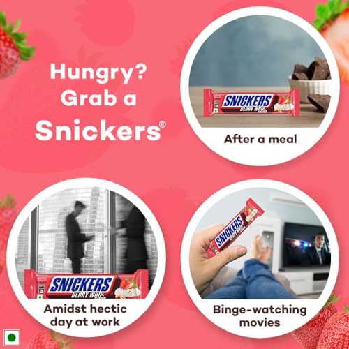 Tired of the same old snack and yearning for something new and different? Well youâve come to the right place! Introducing the all-new Snickers Berry Whip Flavour Chocolate Bar for the chocoholic inside you! The insanely delicious taste of strawberry-flavoured whipped nougat along with the goodness of peanuts make for a perfect treat. Savour this chocolate pack amidst working hours or share it with your favourite people this Snickers chocolate bar will leave you satisfied. Wait thereâs more! Say no to regular desserts and upgrade them with Snickers chocolates. The delectable berry whip flavour makes a great combination with cakes cupcakes puddings and many more! Storage Instructions: Store in a cool dry place. Strawberry-flavoured whipped nougat. Contains no fruit