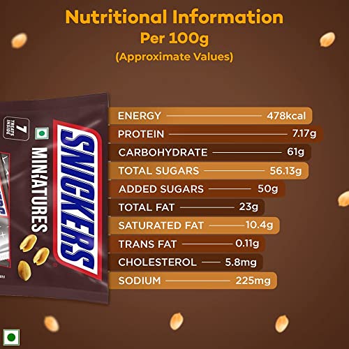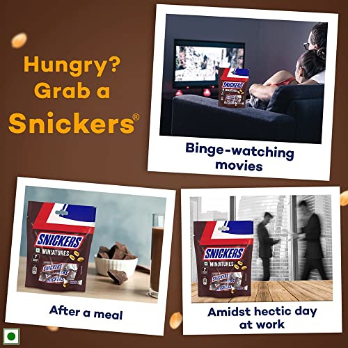 Why this chocolate? Hunger cannot determine the course of your life only you can! Add some peanut power to your day with Snickers miniatures chocolate. Made with real peanuts and chocolate This premium imported chocolate satisfies your taste buds and helps you fuel up during a busy day. Donât let stress get to you brace yourself for a chocolatey peanut collision with Snickers and bid goodbye to unwanted worries. Hurry up and awake the chocolate fanatic in you! What makes it different? Snickers miniatures packed with delicious and nutritious roasted peanuts also contains nougat and caramel creating a flavour thatâs enough to rock your taste buds while bursting hunger pangs between meals. Donât sacrifice taste for nutrition use it as a chocolate gift for your loved ones and watch them enjoy and rejoice in these delicious chocolate treats. When to have these miniatures? Reach out for a Snickers miniatures to tackle snack time while working at home grocery shopping or gaming because youâre not you when youâre hungry. Turn this amazing chocolate into a decadent cake wave goodbye to normal brownies and make delicious Snickers brownies or try quick and tasty Snickers pudding. There is so much that you can do with Snickers the choice is yours! Storage: store in a cool and dry place.