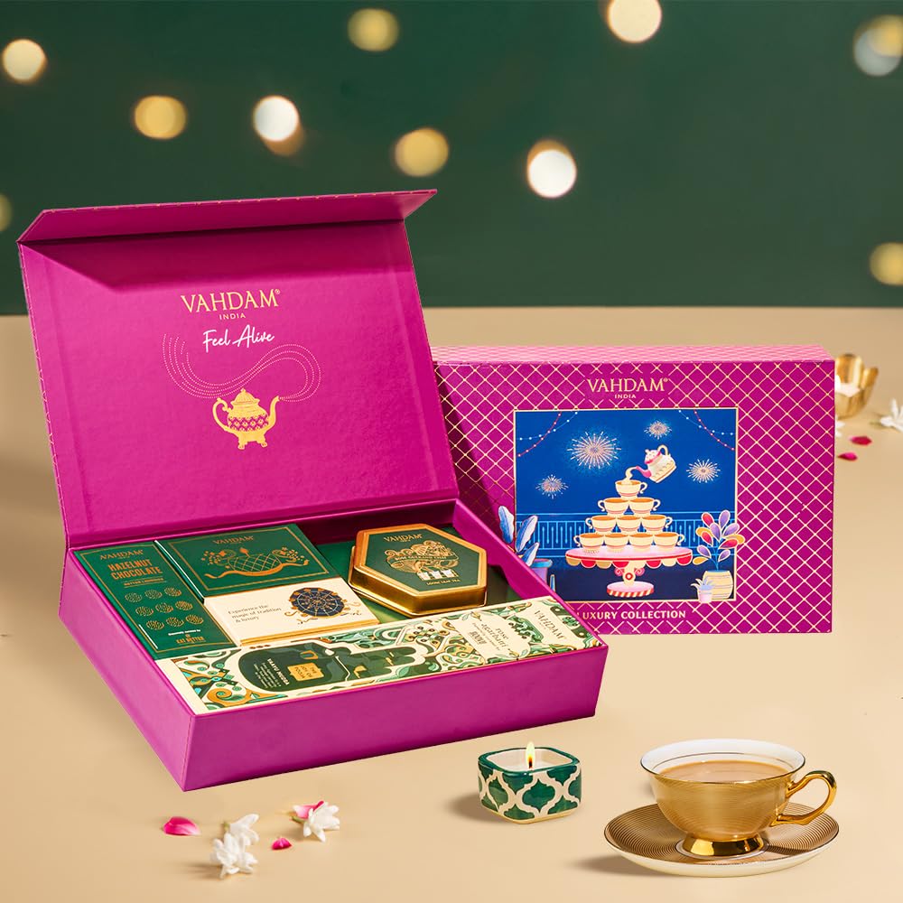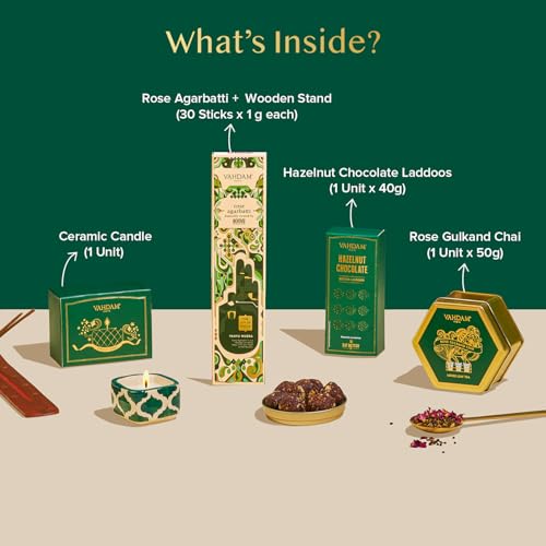 HomeGrocerySweetsChocolatesVAHDAM Diwali Gifts 2024 - Premium Gift Box | Rose Gulkand Chai + Chocolate Laddoos + Ceramic Candle + Rose Agarbatti with Stand | Diwali Gift Items Diwali Gifts for Family & Friends | Gift Hamper