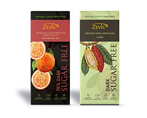 Zevic 70% Belgian Cocoa Dark Chocolate with Orange Zest & Stevia and Classic Stevia Chocolate 40 g (Pack of 2)