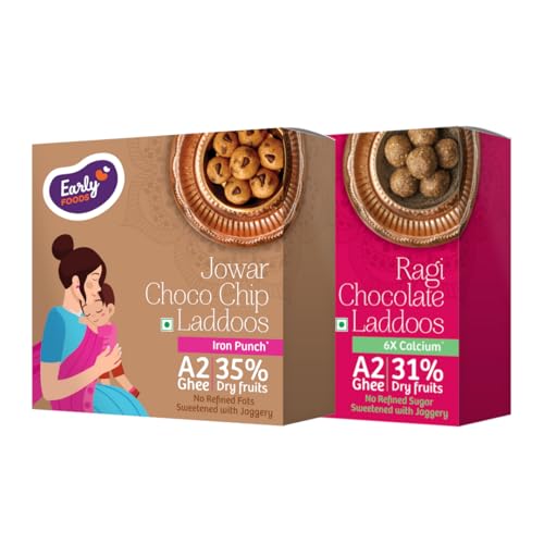 Early Foods : Assorted Pack of 2 - A2 Ghee Jowar Choco Chip & Ragi Chocolate Laddu | Millet Snacks | Kids Snack | Sugar free Sweets with Jaggery | Pregnancy Snack & Lactation Laddu 250g x 2
