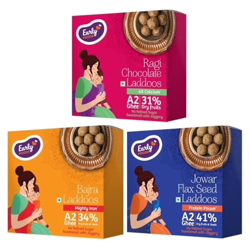 Early Foods - Pack of 3 Laddoos for Kids | Ragi Choco, Jowar & Bajra Laddoos | Sugar Free Laddu | Sweetened with Dates | A2 Ghee Laddoos