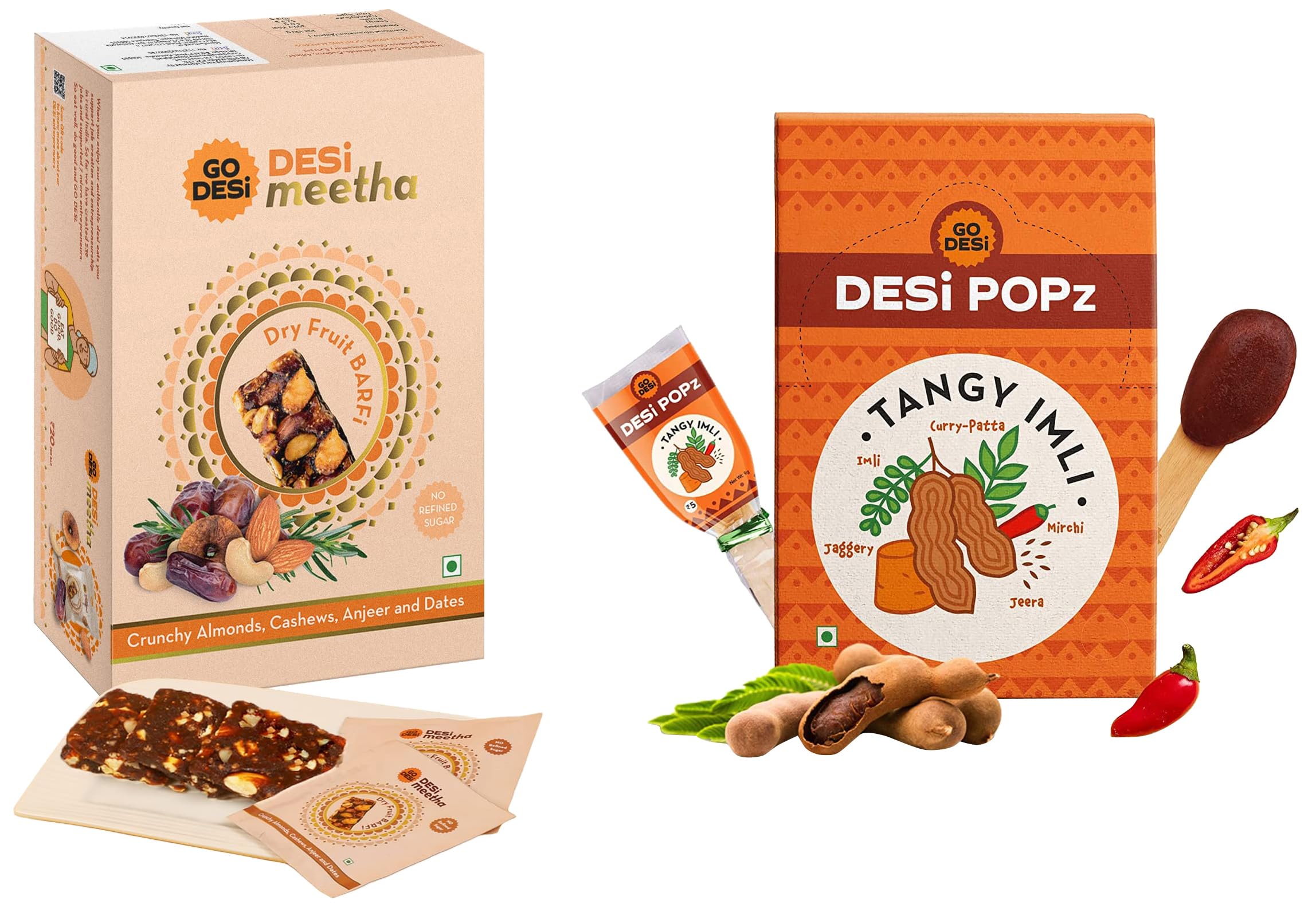 GO DESi Popz Imli Pop 50 Pieces 400 g & Dry Fruits Barfi 400 grams 20 Individually Wrapped Burfi Dates Bar Combo