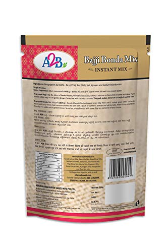 A2B Bajji Bonda Mix Powder - A delicious traditional snack. Ready in an instant. One mix for multiple dishes like Bonda Potato Bonda Vazhakkai(raw banana) / Potato/ Onion/ Potato Bajji Onione Pakoda... Vazhakkai bajji. ... a simple and easy deep fried fritters recipe made with raw banana or plantain. it is a tasty and a crisp snack which has a sweet and savoury taste to offer in each and every bite. Bonda is a typical South Indian snack that has various sweet and spicy versions in different regions. Aloo bonda recipe or potato bonda is a popular South Indian snack and a street food. Onion pakoda recipe â pakoda or pakora are deep fried snack that are made with A2B Bajji Bonda Mix (gram flour salt light spices) and a main ingredient like onion or a vegetable.