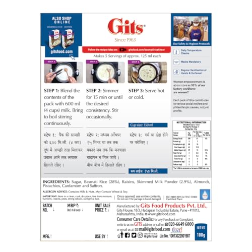 A Favorite Indian Dessert Made From Milk And Rice Gits Basmati Rice Kheer Can Be Relished Hot Or Cold! It Has A Thick And Creamy Texture And Is Garnished With Almonds Pistachios And Raisins. This Mix Has Notes Of Saffron And Cardamon For Enhanced Flavors. From All Festivities To Sweet Endings To A Meal Basmati Rice Kheer Can Be The Perfect Dessert!Gits Have Been A Pioneer And One Of The 1St Indian Food Manufacturing Companies To Bring Instant Food Mixes And Have Been Providing The Best Quality And A Wide Range Of Products In The Ready Meals Instant Mixes Open & Eat Desserts And Dairy Categories To Our Consumers Since 1963. You Can Be Sure Of The Product When You Know It Is From The House Of Gits.