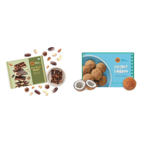 HomeGrocerySweetsIndian SweetsGO DESi Dry Fruits Barfi 200 grams and Coconut Ladoo 300 grams Rakhi Gift for Sister and Brother Indian Sweets Gift Pack Sweets Indian Mithai