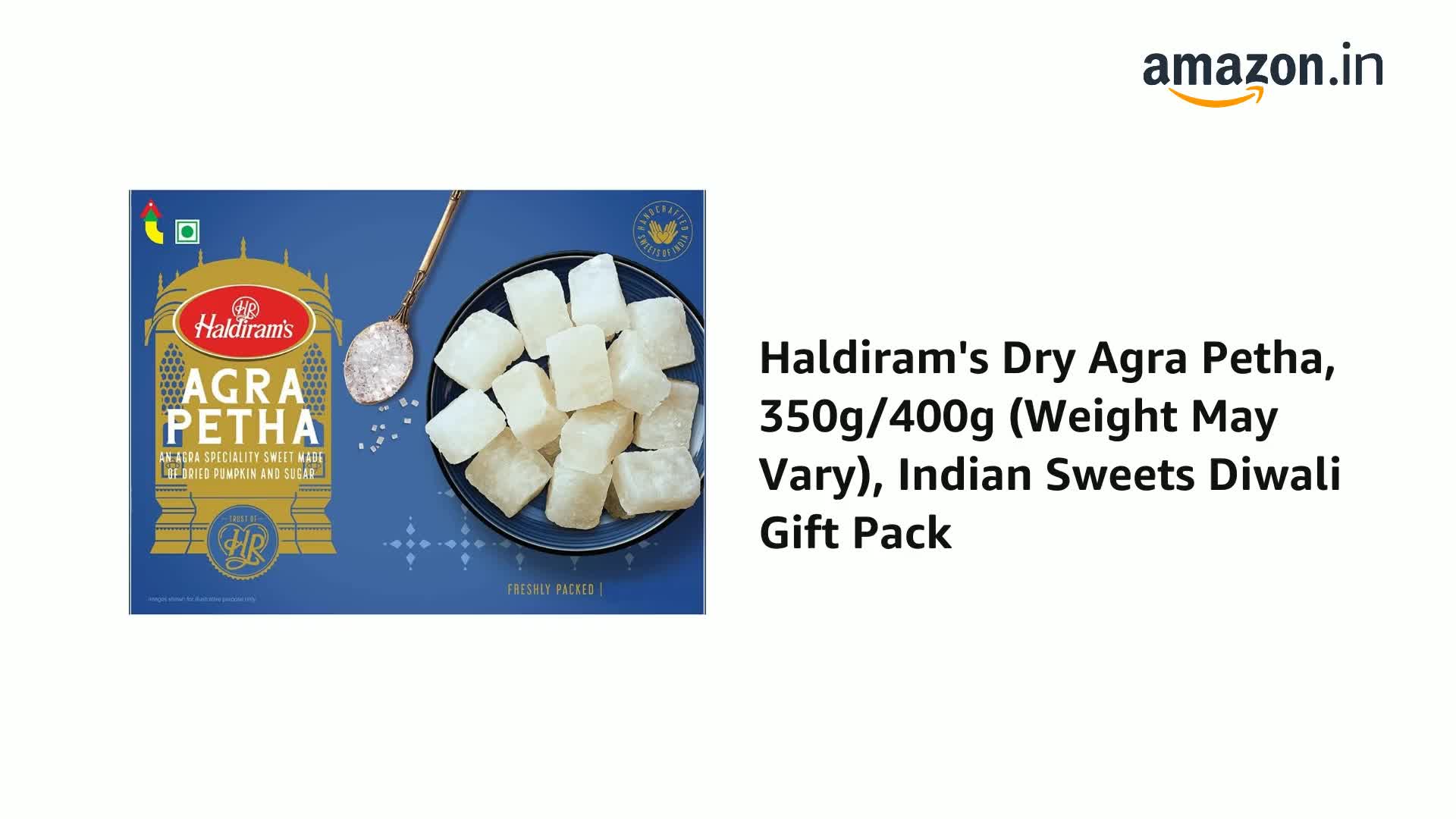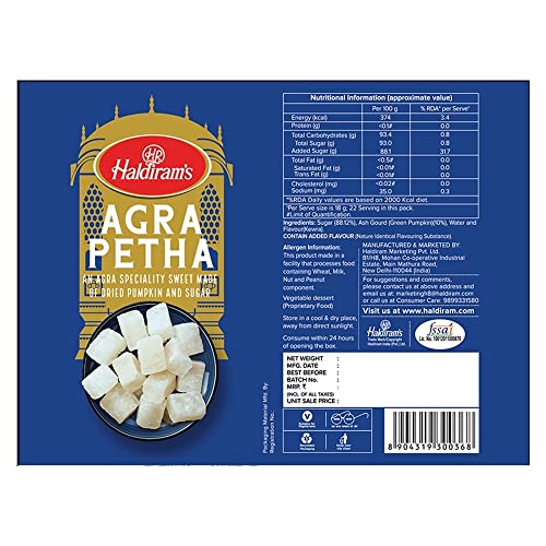 Haldiram Agra petha an Indian product. It high selling product.Haldiram Agra Petha is a traditional sweet made from Sugar & Pumpkin. Haldiram's Agra Petha are soft chewy cubes of candied winter melon.