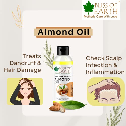 Bliss of earth sweet almond oil possess many inflammatory properties making it great for body massage. It can ease muscle tension heal cracked skin and promote healthy nail growth. As a mild hypo-allergic oil its safe for sensitive skin including baby skin. For Skin: To fight wrinkles and achieve a glowing complexion apply 2-4 drops of sweet almond oil to clean fingertips and gently massage into the skin after washing your face. For Baby massage: Rich in oleic acid and linoleic acid sweet almond oil moisturises the baby skin if massaged before and after giving bath to baby.