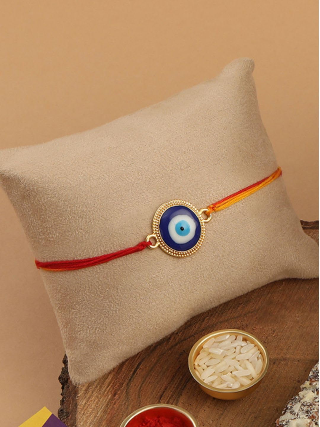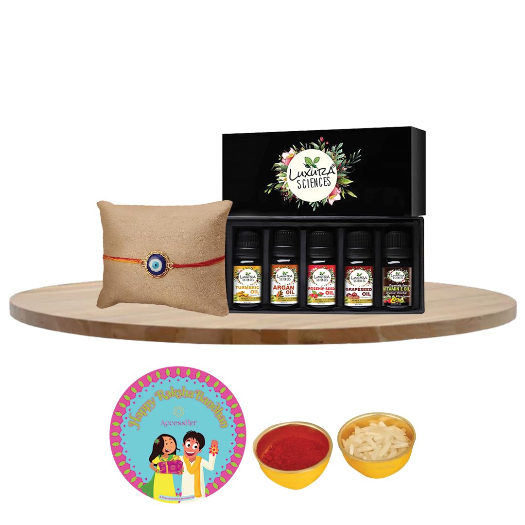 Accessher Quirky Evil eye rakhi Combo with Luxura Sciences Organic Essential Combo oils Best Rakhi Gift Pack of 4 with Raksha Bandhan Card Roli Kumkum