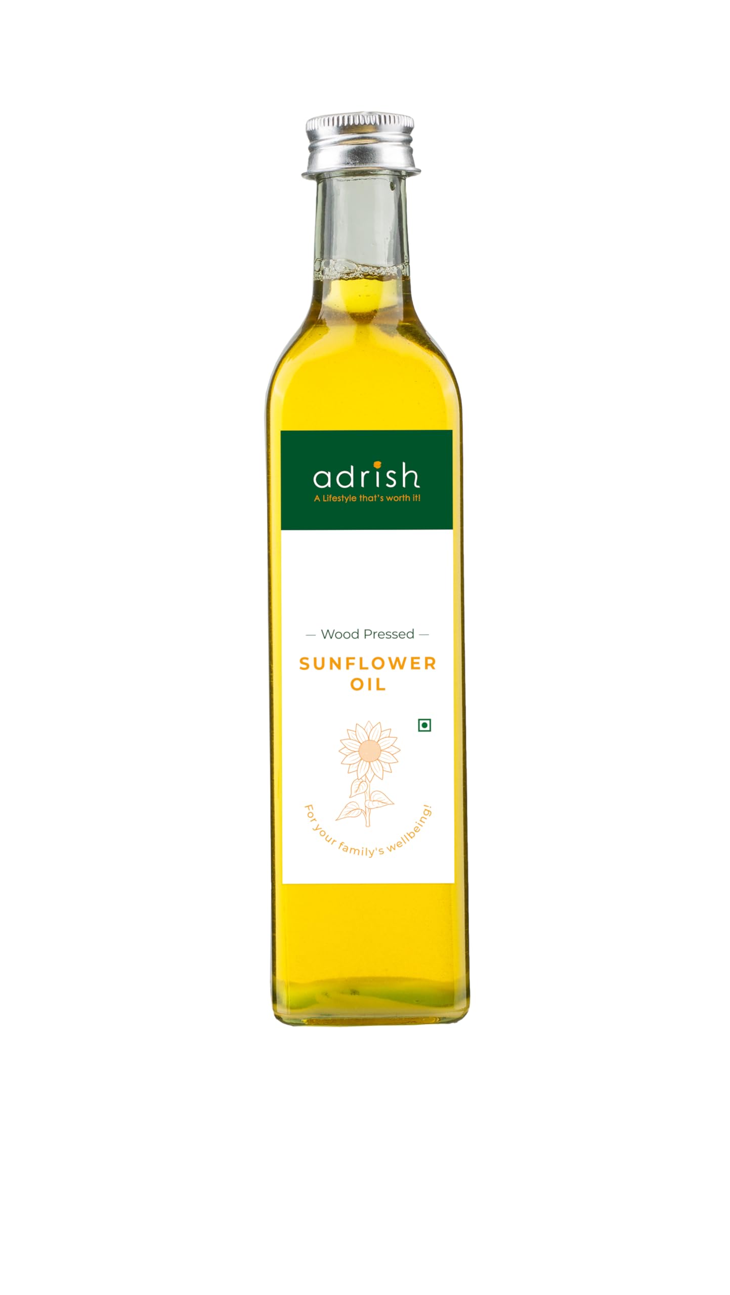Adrish Zerowaste Wood Pressed Sunflower Oil - (500ml) - Organic | Unrefined Cooking Oil| Wooden Ghani | High in Anti-Oxidants | Kachi Ghani Sunflower Oil | Glass Bottle