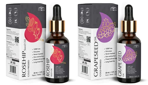 • PACKAGE CONTENTS: 30 ml each of Pure Pressed Rosehip and Grapeseed Carrier Oils in beautiful glass bottles with dropper