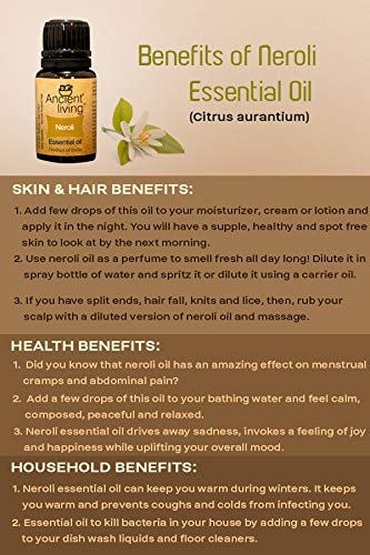 ORGANIC NEROLI ESSENTIAL OIL PRODUCT DESCRIPTION This essential oil was popularized by the princess Nerola of Italy when she started using it to perfume her gloves and her bath. Since then this distinctive essence has been called Neroli. We bring to you this spicy and flowery smelling history which holds ability to drive away all your anxious feelings. When diffused this oil invokes feelings of joy. When used as massage oil it improves blood circulation and keeps your skin healthy and supple. When used as a perfume it masks bad odors and keeps you smelling fresh! When used as bath oil it helps you feel calm composed and relaxed. INGREDIENTS Neroli oil It is obtained by the steam distillation of the flowers of the Bigarade orange tree. It smells sweet and orangey with spicy and bitter undertones to it. All our ingredients are extracted out of our farm or from other sustainable organic farms thus making our essential oils pure and therapeutic grade. BENEFITS SKIN AND HAIR BENEFITS Neroli oil can cure acne when applied to the affected area. Add of few drops of this oil to your moisturizer cream or lotion and apply it in the night. You will have a supple healthy and spot free skin to look at by the next morning. Use neroli oil as a perfume to smell fresh all day long! Dilute it in spray bottle of water and spritz it or dilute it using a carrier oil and apply it to the key areas. If you have cracked and dry feet then give your feet some love and massage them with this oil. Opt to keep them immersed in a tub of warm water for maximized effects. Add a few drops of this oil to a carrier oil to make your own neroli massage oil! Neroli oil is a natural cure for stretch marks. Apply it to your stretch marks before bedtime and witness its wonder. If you have split ends hair fall knits and lice then rub your scalp with a diluted version of neroli oil and massage.