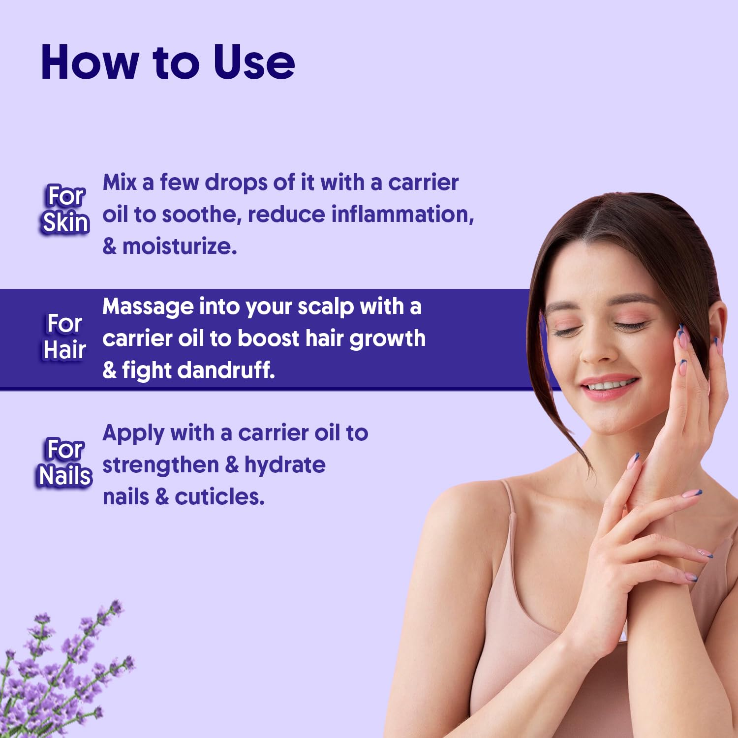 • HAIR GROWTH & ANTI-DANDRUFF: Mix a few drops of Lavender Oil with Coconut Oil and massage your scalp & hair for the improved scalp hair and beard health.