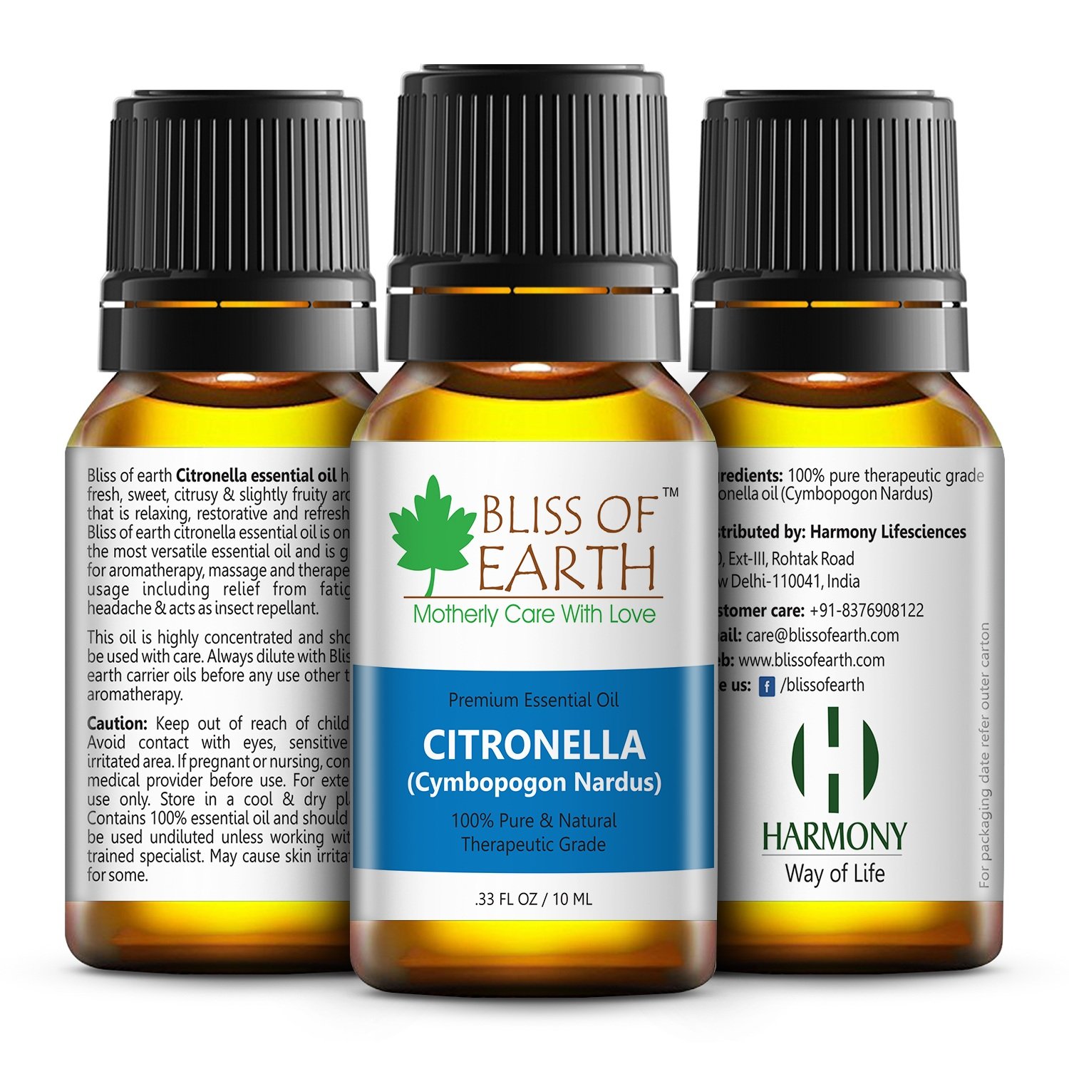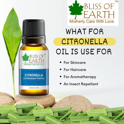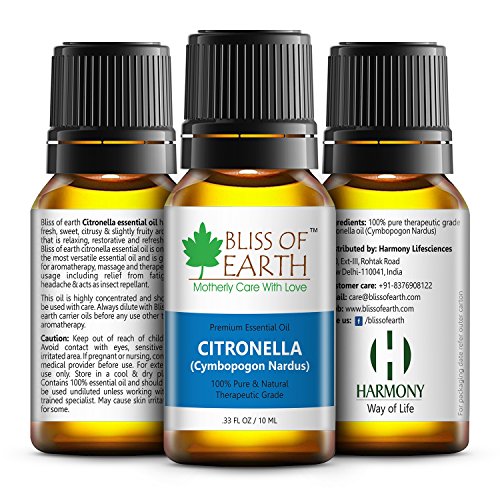 Bliss of earthandtrade citronella essential oil has a fresh sweet citrusy and slightly fruity aroma which is relaxing restorative and refreshing. Bliss of earthandtrade citronella essential oil is one of the most versatile essential oil and is great for aromatherapy massage and therapeutic usage including relief from fatigue shadow and acts as insect repellent. This oil is highly concentrated and should be used with care. Always dilute with bliss of earth career oils before any use other than aromatherapy.".