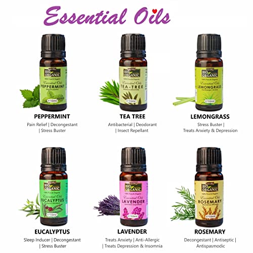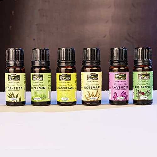 A super-elegant gift pack ideal for all occasions this set of 6 best essential oil combo pack has been put together to enchant your senses. The oils can be used with many products for creating healing and damage-repair face and hair masks healing baths skin healing aroma diffusers and for aromatherapy.Uplift your mood instantly and heal your bodyPure Peppermint Essential Oil and Eucalyptus Essential Oil for hair soothe the scalp and help stimulate new hair formation. Pure Tea Tree Oil fixes acne and skin blemishes. Rosemary Essential Oil pure stimulates blood flow onto the scalp thereby regenerating new hair. Lemongrass Essential Oil for face and Lavender Essential Oil for skin enhance natural skin glow and add gloss. The 2 oils also alleviate anxiety and relieve stress. Lavender Oil for sleep doubles up for aromatherapy and for usage in home aroma diffusers.Create your own holistic healing solutionsThe 6 essential oils have been provided in their raw natural and purest form which you can use to create your own super-healing masks or packs. Mix them up with your own choice of salts clays creams or oils to make your own creative and enjoyable healing solutions. Create your own stimulating baths or nourishing massages to heal yourself inside out.Highly recommendedSourced directly from nature's lap and steam distilled at normal temperatures the organicity of the oils are perfectly maintained. No chemicals additives are used to maintain purity of the oils. Certified organic by USDA Organic and ECOCERT the Food Safety and Standards Authority of India (FSSAI) certifies Peppermint and Lemongrass Essential Oils as edible. All oils are cruelty-free and vegan.