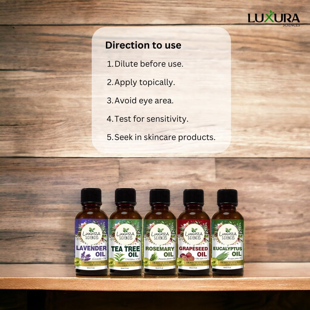 Luxura Sciences Organic Essential Oil Combo Pack of 5 Oils ;ANTI ACNE Essential Oil Kit 5 * 15ml (Tea Tree Oil; Lavender Oil; Eucalyptus Oil; Grapeseed Oil; Rosemary Oil)