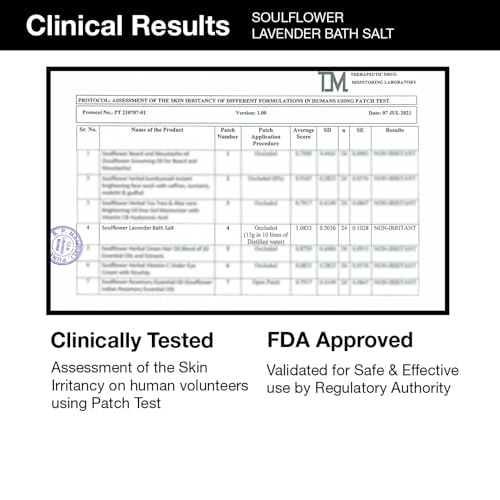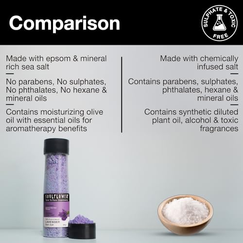 • PREMIUM GRADE INGREDIENTS: Our Natural & Preservative Free Vitamin E infused Soulflower Lavender Bath Salt is a blend of Natural & Synthetic Free Sea Salt Pure Undiluted Lavender Essential Oil & the highest quality Olive Oil which ensures to give all its