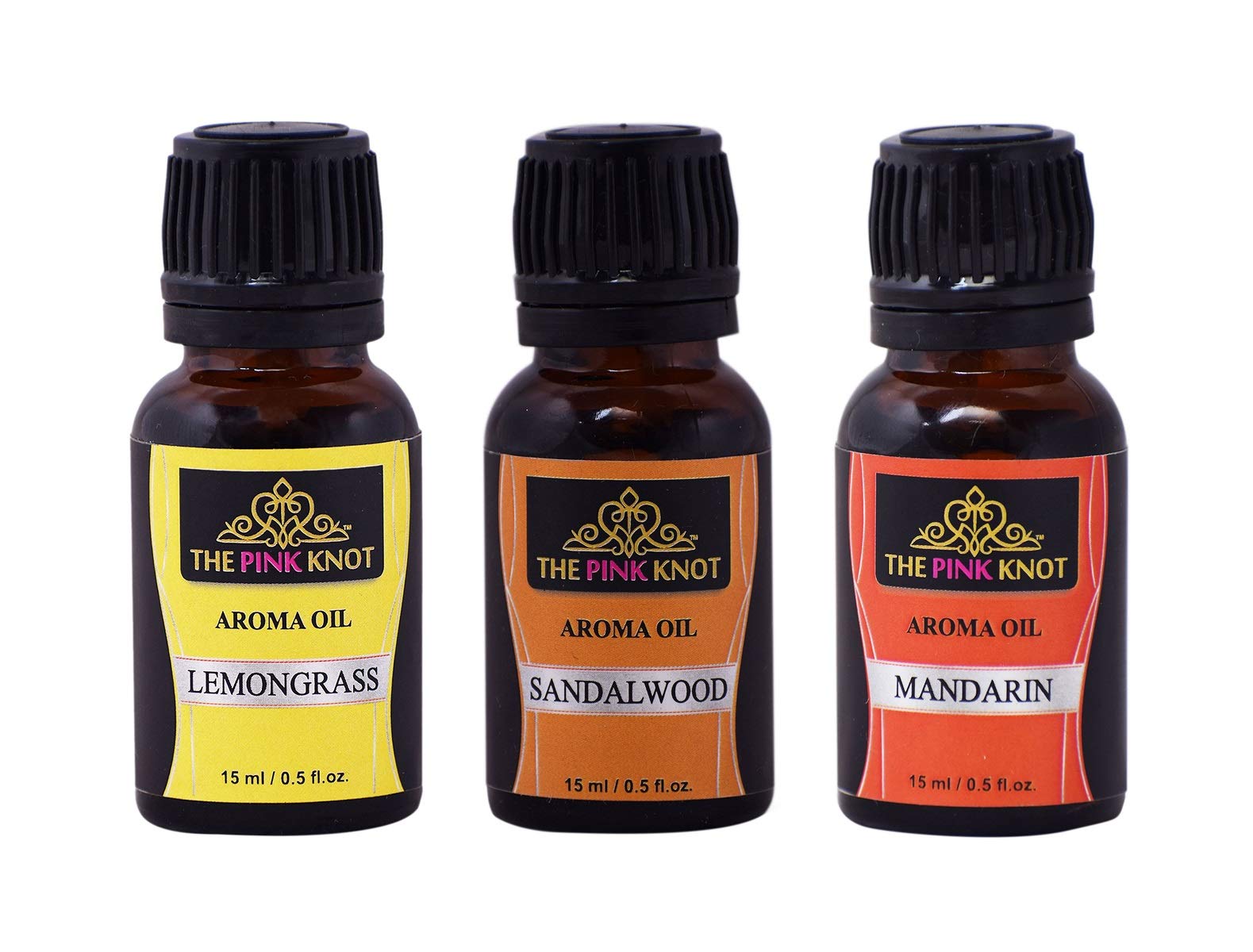The Pink Knot Lemongrass Sandalwood & Mandarin set of three aromatic fragrant diffuser oil (15ml each)