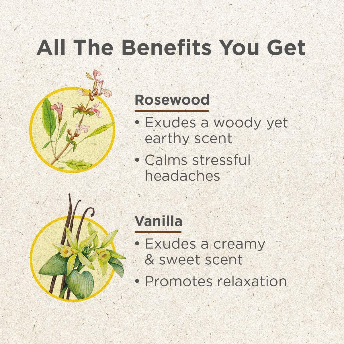 • DIFFUSE OR TOPICAL - Blend rosewood essential oil & vanilla essential oil into diffuser together to relieve headaches for carefree moments.
