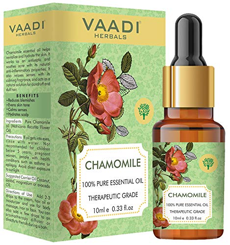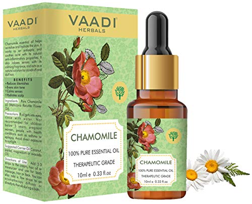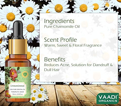 VAADI HERBALS has invested in research and innovations to produce a range of time-tested herb based essential oil range to enhance beauty and soothe & calm mind body and senses just the way nature intended us to be. Our commitment to quality extends throughout every phase of product development manufacturing and packaging. Herbs are checked for their essential qualities and tested at our laboratories where each ingredient is individually tested before it can be used to make a final product.About our essential oil range extracted through careful steam distillation and cold pressing only the purest essential oils are used in our range of oils.Chamomile has a sweet aroma with a hint of a fruity side. Its warmth and gentleness can help create a relaxing and calming atmosphere that can make a wonderful addition to family areas. Soothing to all types of skin It often used in skin and hair products and even perfumes. Chamomile has been used as an herbal remedy since ancient times. Chamomile is a low-growing plant with parsley-like leaves and daisy-like flowers. The flowers are steam distilled to create roman chamomile essential oil.