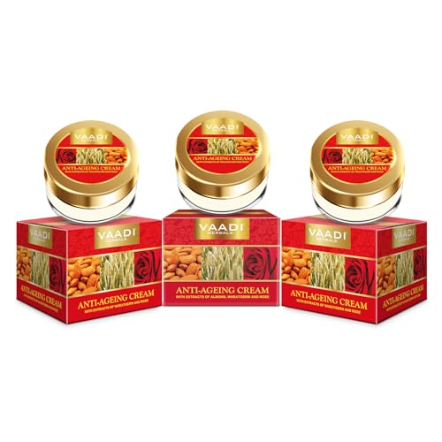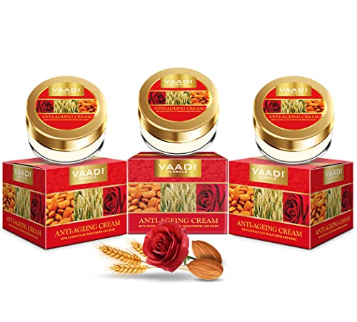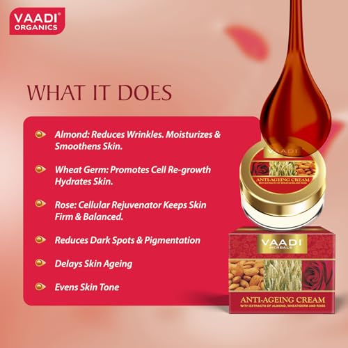 Enriched with the multi vitamin content of almonds wheat germ and rose this cream has been specially developed to fight signs of aging. With a high concentration of vitamin A and E potent anti oxidants this cream promotes cellular renewal while boosting production of collagen. Smoothing and delaying wrinkles its keep your skin supple and youthful.One cannot defy time or the aging process. Over the time the skin is bound to age. But if skin care is given an utmost importance one can age with poise. Vaadi Herbals' Anti-Wrinkle Cream is packed with Almond Oil Wheatgerm Oil and Manjistha all three of which together form the perfect Age-with-Grace formula. Regular application of the Anti-Wrinkle Cream reduces fine lines tightens the skin boosts the regeneration of cells and provides the necessary hydration to the skin making it younger smoother and softer.How does Wheatgerm Oil fight wrinkles and age?Wheatgerm Oil is obtained in unrefined form from the core (or kernel) of wheat grain. In comparison with any vegetable oil Wheatgerm Oil contains the maximum percentage of Vitamin E. Apart from gifting the skin a supple glow it is known to treat dry patches by maintaining the natural moisture balance. It is effective on all skin types. The presence of Vitamin E makes Wheatgerm Oil a very powerful antioxidant which fights wrinkles and fine lines. On a regular application premature aging stops and a younger-looking even toned skin is visible. Dark spots under-eye circles and pigmentation are effectively cured by Wheatgerm Oil. It soothes the skin and works on cell renewal and fighting wrinkles. Wheatgerm Oil works effectively by penetrating deep into the layers of the skin and providing moisture to the skin cells which in turn increases skin elasticity. Collagen production is significantly boosted by regular use of Wheatgerm Oil. Wrinkles fade away in no time and the aging process definitely hits a halt.How does Manjistha help in skin rejuvenation?Rubia cordifolia or Manjistha is a very effective herb that helps in improving skin complexion as it percolates down the skin and improves in circulation of blood. Also Manjistha fights skin disorders like pigmentation black spots scars irregular tanning leading to discoloration and sun burns. Manjistha brings back the glow and youthful sheen that diminishes due to aging of the skin. By promoting a faster healing of the skin Manjistha acts both as a shield as well as a nourishment provider to the skin. Pimples freckles wrinkles and fine lines are effectively dealt with by this powerful herb. Manjistha improves skin's texture and elasticity. The aging process slows down due to better blood flow and skin is radiant squeaky clean and full of life.How does Almond Oil nourish the Skin?Sweet almonds' or Prunus dulcis dry kernel yields almond oil. A light-weighted oil Almond Oil is an effective emollient that soothes the skin and relieves skin irritation and itchiness. Almond Oil penetrates deep in the skin's layers and provides moisture and nutrients to the skin to make it healthier smoother and glowing with life. Being rich in Vitamin E regular application of Almond Oil fades away wrinkles fine lines and dry patches. Also the aging process slows down. On the surface Almond Oil acts as a shield from sun pollution and skin-aging factors and on the inside it hydrates the skin cells boosting cell growth and suppleness.