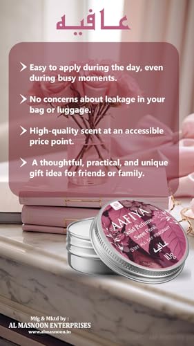 Discover the enchanting Al Masnoon Aafiya Solid Perfume in a 10g pack featuring a captivating Arabic Sweet Floral Fragrance. This versatile solid perfume can be used as both a deodorant and an after-bath scent offering a refreshing and long-lasting aroma that lingers beautifully on your skin. The sweet floral notes create a harmonious blend that feels both luxurious and soothing perfect for everyday wear. Its compact and travel-friendly design makes it ideal for on-the-go use while its skin-friendly formula ensures a smooth non-greasy application. Indulge in the timeless freshness and elegance of Al Masnoon Aafiya and embrace a fragrant experience that lasts all day.