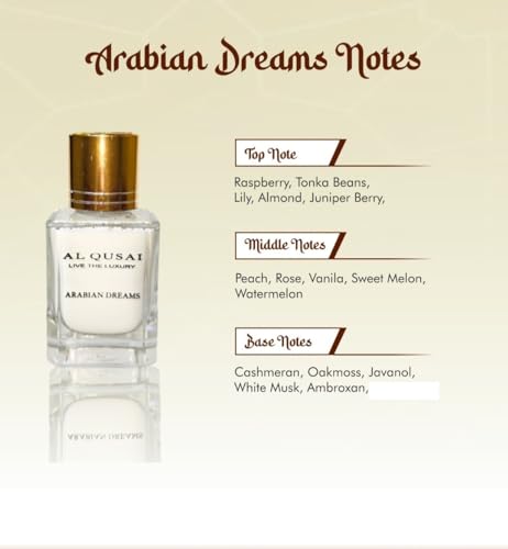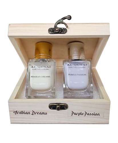 Al Qusai Arabian Dreams A finely brewed scent consisting of skilfully prepared blend of Arabic aromas which will instantly transport you to the glorious Arab era. Highly prized Tonka beans are combined with a whiff of almond in the top notes. These top notes are joined by a calming scent of blooming rose and a faint hint of ripening peach. Around the thick layers of white musk the Javanol and Vanilla give a soothing experience. LIVE THE LUXURY with Al Qusai - Arabran Dreams and develop a durable veneer of Arabian elegance to-your persona. Al Qusai Purple Passion A purple concoction with fruity aromas create an enticingly sensual scent with a lingering sweetness. The top notes of berries and blossoming cherries entice you and the lily's centre notes give off a fresh floral aura. LIVE THE LUXURY with Al Qusai -Purple Passion a tantalizing scent which will craft a sophisticated aura around you and bring out your Passionate side.
