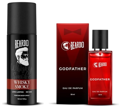 Beardo Godfather Perfume for Men | Aromatic Spicy Perfume for Men Long Lasting | Date night fragrance Body Spray for Men Ideal gift for men 50mlBEGIN YOUR RULE. Be prepared to captivate the senses of one and all with the powerful enigma of Beardo Godfather EDP. Beardo Godfather perfume has an alluring and authoritative appeal that instantly overshadows ordinary perfumes. Beardo Godfather is created to be versatile for all occasions yet it is sure to make you stand out. Its unique and powerful scent is fit to be used during day as well as night. It is a unique combination of citrus and spicy notes which make it fit for all seasons too.Beardo Whisky Smoke Perfume Body Spray for Men 120ml | Spicy Woody - Oudh No Gas Deo for Men Long Lasting |Date night Deodorant for Men |Gift for menNo Gas Deo for Men Long Lasting