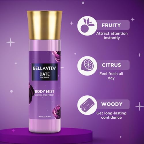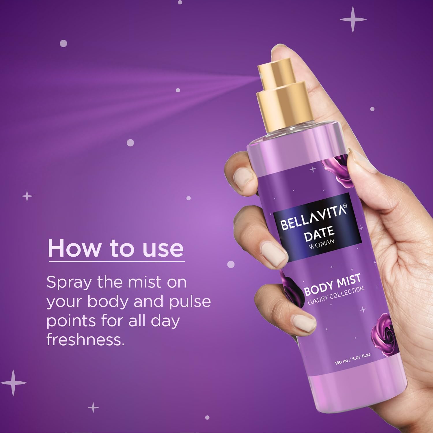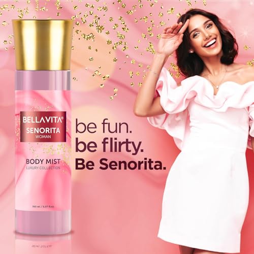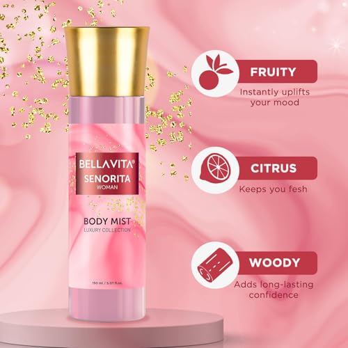Bella Vita Luxury Date Women Body Spray Mist Perfume for Refreshing Floral & Vanilla Long Lasting Fragrance with Pink Pepper and Red Fruits 150 mlDate Body Spray Mist : Feel loved everyday with the DATE Woman Body Mist by Bella Vita Luxury. With top notes of pink pepper and red fruits get ready to make others blush with the lingering sweetness of vanilla. Perfect to make every moment spent with your loved one unforgettable. Senorita Body Spray Mist : Your daily dose of freshness and fun begins with the Senorita Woman Body Mist by Bella Vita Luxury. A flirty floral and fruity scent for women Senorita Woman is infused with top notes of yuzu pomegranate and mint along with peony and magnolia at its heart. Musk mahogany and amber add the perfect balance enhancing longevity for your inner Senorita to frolic all day.Bella Vita Luxury Senorita Women Body Spray Mist Perfume for Refreshing Floral & pomegranate Long Lasting Fragrance with Mint 150 MlYour daily dose of freshness and fun begins with the Senorita Woman Body Mist by Bella Vita Luxury. A flirty floral and fruity scent for women Senorita Woman is infused with top notes of yuzu pomegranate and mint along with peony and magnolia at its heart. Musk mahogany and amber add the perfect balance enhancing longevity for your inner Senorita to frolic all day.