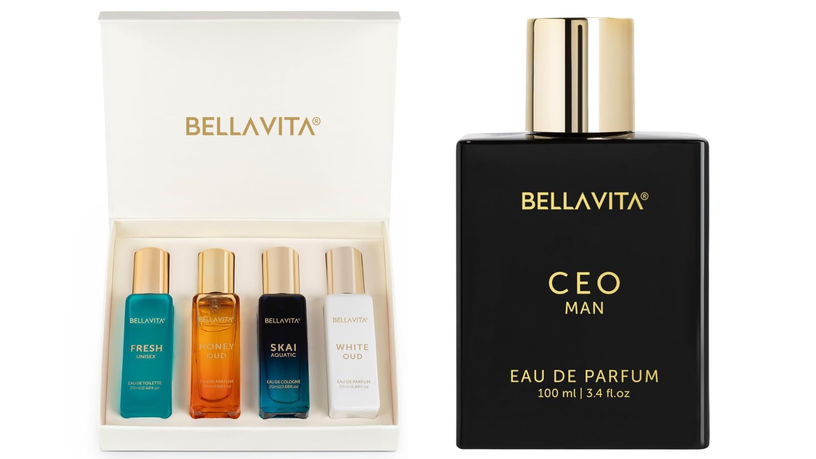 Bella Vita Luxury Unisex Eau De Parfum Gift Set 4 x 20ml for Men & Women with SKAI FRESH WHITEOUD PATCHOULI Perfume|Long Lasting EDP Fragrance Scent"Unbox a treasure of little luxuries with our Unisex Luxury Perfume Set that makes for the perfect gift for everyone. An arsenal of indulgence this box set carries some of Bella Vita Organic's most iconic fragrances. A little bit about the fragrances in the Bella Vita Organic Unisex Luxury Perfume Set: White Oud: The Spice Odyssey. Charmed by the tangy Artemisian Lemon at the top freesias at its heart and amber at its base The White Oud is a revelation of all things 'sweet' and 'spice'! Skai: Exudes Freshness and Sophistication. Top note of bergamot fuses perfectly with Ambergis at its base and pink pepper at its heart. The Skai Aquatic Eau De Cologne has a fresh appeal for the effortlessly sophisticated yet understatedly charming! Fresh: A mythical fragrance rephrasing ancient elegance. Top Bergamot note is accentuated by lavender at its heart and Ylang-Ylang at its base manifesting an irresistibly iconic appeal. A breath of Fresh air the Fresh Eau De Toilette is full of purity and versatility! Patchouli: An exhilarating blend that transpires us into the Imperial apothecary. Considered a powerful plant essence Patchouli orchestrates sweet spicy smokey and cedar(y) notes.Bella Vita Luxury CEO MAN Eau De Parfum Perfume for Men with Lemon Lavender Tonka & Agarwood|Woody & Spicy Long Lasting EDP Fragrance Scent 100 MlLife in the Fast Lane! Perfect for everyday wear CEO MAN Eau De Parfum elevates the 'CEO' in you. Refreshingly daring yet long-lasting with top hints of lemon and sugar delicately energising with Lavendar at its heart and finally arise the vetiver moss and tonka's sharply-dressed base. This perfume honours your debonair and charismatic personality allowing you to be true to yourself just with the 'CEO' touch added to it!