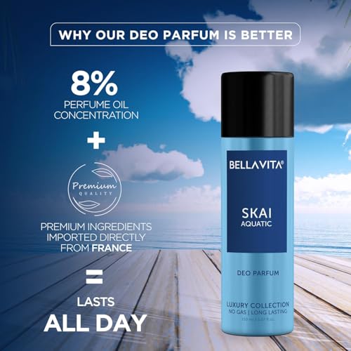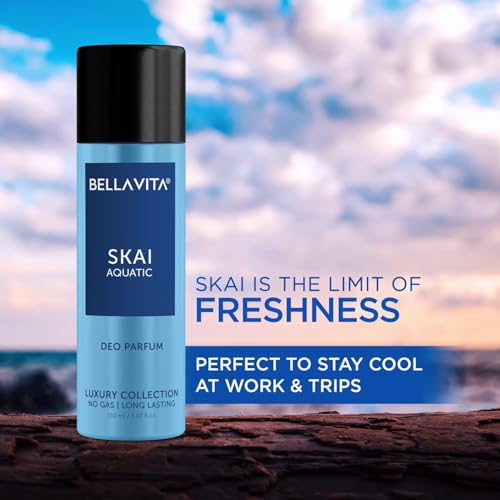 Bella Vita Luxury SKAI AQUATIC No Gas Deodorant Body Parfum for Men with Bergamot Pineapple Lavender | Aquatic & Fresh Fragrance Musky & Premium & Long Lasting Body Perfume DEO 150 MLReach for the sky and be limitless with SKAI Aquatic Deo Parfum. Top notes of citrus bergamot coriander mandarin and pineapple give you an instant burst of energy while heart notes of clary sage lavender and pink pepper keep you cool and collected as you take on the day. Patchouli at the base keeps you grounded and adds confidence as you reach for the stars.Bella Vita Luxury Skai Aquatic Eau De Cologne Unisex Perfume for Men & Women with Bergamot Pink Pepper |Long Lasting Aqua EDC Fragrance Scent 100 MlExudes Freshness and Sophistication. An iconic blend of bergamot and coriander at the top fuses perfectly with the invaluable at its base and pink pepper at its heart. The Skai Aquatic Eau De Cologne has a fresh appeal for those who are effortlessly sophisticated yet understatedly charming