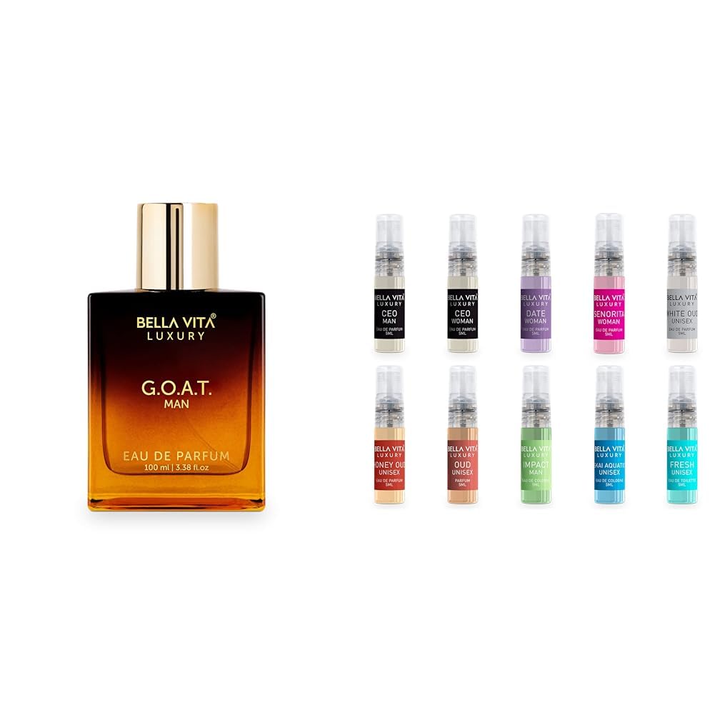 Bella Vita Luxury G.O.A.T Eau De Parfum Perfume for Men with Bergamot Lavender & Patchouli|Woody & Oriental Long Lasting EDP Fragrance Scent 100 MlBella Vita Luxury G.O.A.T is an ode to the men who are masters of their crafts the Greatest Of All Time. For those who push the boundaries and let their success do the talking. For those who want to change the world and leave a lasting impression. Bergamot and lavender notes are refreshing while woody patchouli and vetiver leave a warm soothing fragrance.Bella Vita Luxury Trial Pack of 10 x 5ml Pocket Perfumes for Men Women Unisex Fragrance Mix of EDP EDT & EDC Long Lasting Perfume Sweet Floral Woody Musky & SpicyThis trial pack contains: CEO Man Eau De Parfum (5ml): A daring and long-lasting perfume for the boss man. IMPACT Man Eau De Cologne (5ml): Leave a long-lasting impression wherever you go. SKAI Aquatic Eau De Cologne (5ml): A unisex cologne that is both subtle and charming. FRESH Eau De Toilette (5ml): Get ready to take on the day with a burst of energy. HONEY OUD Parfum (5ml): A sinful exploration of honey for the sweeter facets of life. OUD Parfum (5ml): An ode to honouring eternal grace and power. WHITE Oud Eau De Parfum (5ml): A beautiful blend of all things âsweetâ and âspiceâ. SENORITA Eau De Parfum (5ml): For a sensual and exciting start to your day. DATE Woman Eau De Parfum (5ml): For days that celebrate love and romance. CEO Woman Eau De Parfum (5ml): Make a sophisticated statement wherever you go. Benefits: Pack of 10 best-selling perfumes Mix of Men Women Unisex perfumes. How to use: Hold the bottle 15-20 cm away from your body and spray the perfume on your neck body and your pulse points.