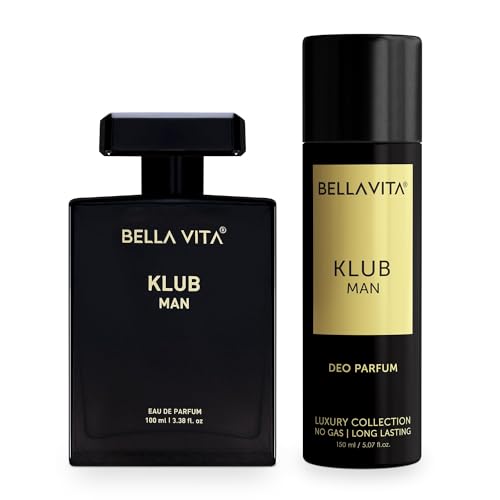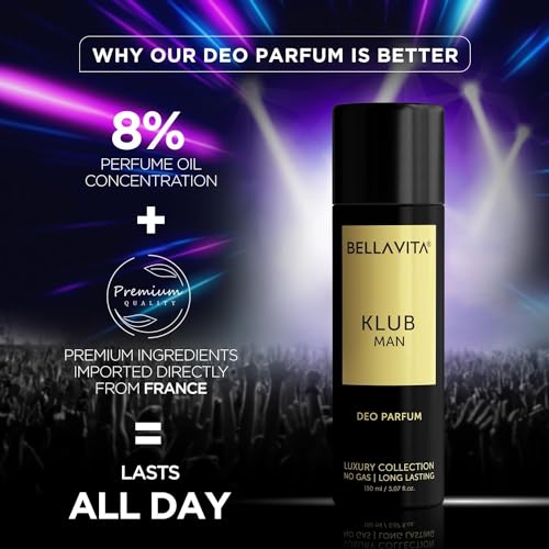 Bella Vita Luxury KLUB Man No Gas Body Deodorant Parfum for Men with Lemon Rose and Vanilla|Musky and Spicy Long Lasting Body Perfume DEO 150 MlBe the life of the party with K.L.U.B Man Deo Parfum a fragrance that inspires you to party to the fullest. Wear it to smell great through the night as you dance into the wee hours of the morning. Top notes of lemon pineapple blackcurrant and apple pack a refreshing punch while heart notes of birch jasmine and rose add freshness. Base notes of musk vanilla and patchouli make this spicy long-lasting fragrance your companion for a great time all the time.Bella Vita Luxury KLUB Man Eau De Parfum Perfume for Men with Lemon Rose and Vanilla|Musky and Spicy Long Lasting Premium EDP Fragrance Scent 100MlBella vita luxury klub man men edp eau de parfum perfume premium best affordable luxurious long lasting scent fragrance attar every day daily party office evening wear musky woody spicy oriental fresh