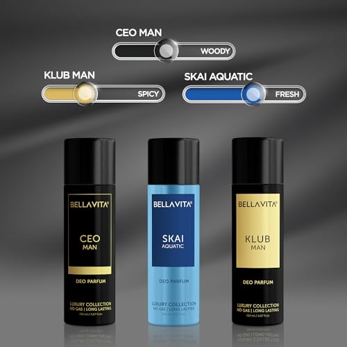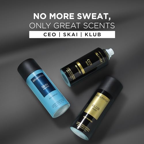 Bella Vita Luxury Unisex Body Parfum Deo Spray Gift Set,Pack Of 3 X 150 Ml, No Gas Long Lasting Premium Fragrance Deodorant|Ceo Men|Skai Aquatic|Klub Men|With Tonka, Bergamot & Vanilla