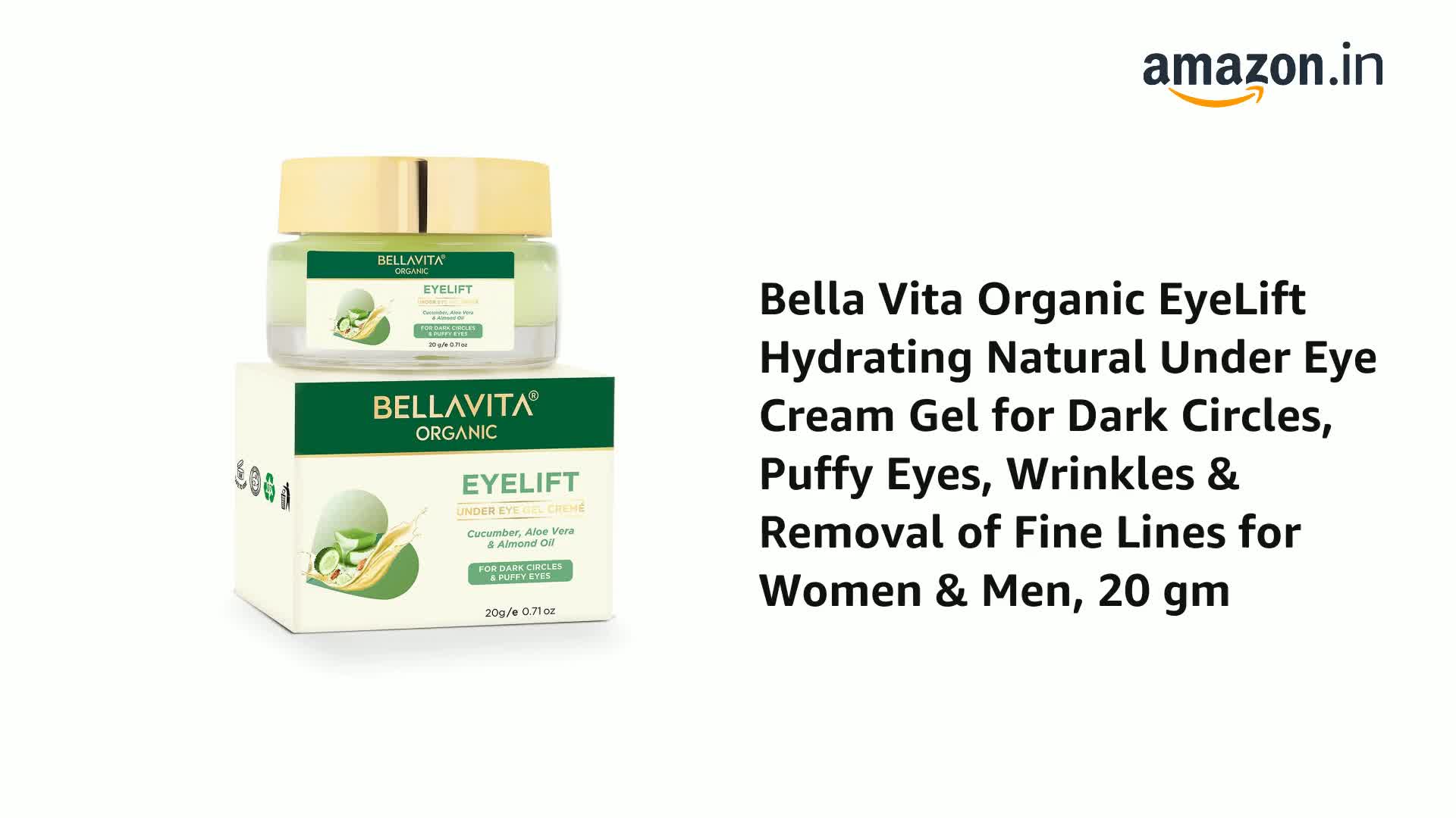 Eye lift under- eye cream gel Bella Vita Organic eye lift is an intensive under-eye treatment gel cream. Its non-greasy fast absorbing formula feels light on eyes and contains powerful natural plant extracts that doesn't irritate delicate under-eye skin. This formulation is power-packed with vitamins (c e) anti-oxidants (retinol) nutrients that repairs under-eye skin from within and helps in maintaining youthful skin. It is perfect for delicate under-eye skin and fights several issues like- dark circles eye bags puffiness wrinkles and fine lines. How to use: Apply the product in small dots around the eye area using your ring finger. Gently tap in the cream and massage in circular motion until thoroughly absorbed. Can be used on all skin types. Benefits: lighten dark circles hydrates & nourishes under-eye skin reduces eye bags & puffiness boost collagen & improves skin elasticity reduces fine lines & wrinkles (crow's feet) intensively repairs under-eye skin.