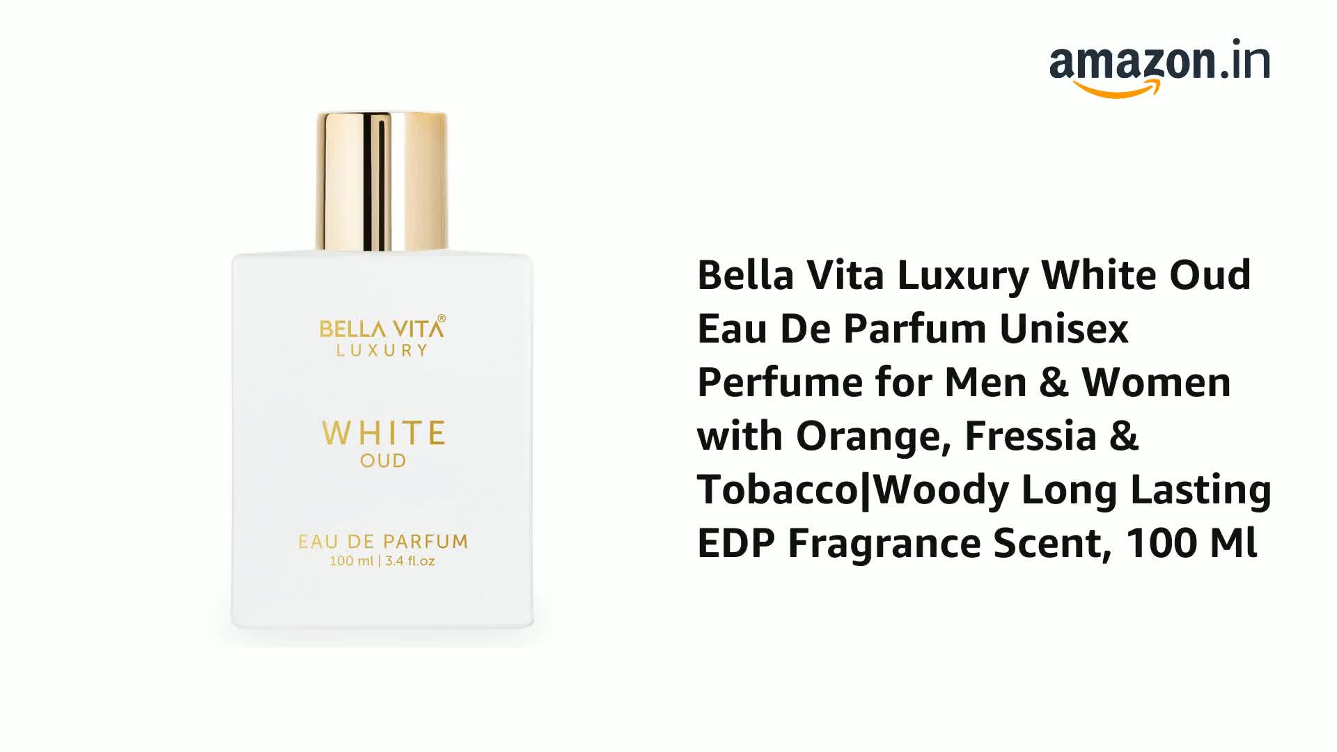 Bella Vita Luxury White Oud Eau De Parfum Unisex Perfume for Men & Women with Orange, Fressia & Tobacco|Woody Long Lasting EDP Fragrance Scent, 100 Ml