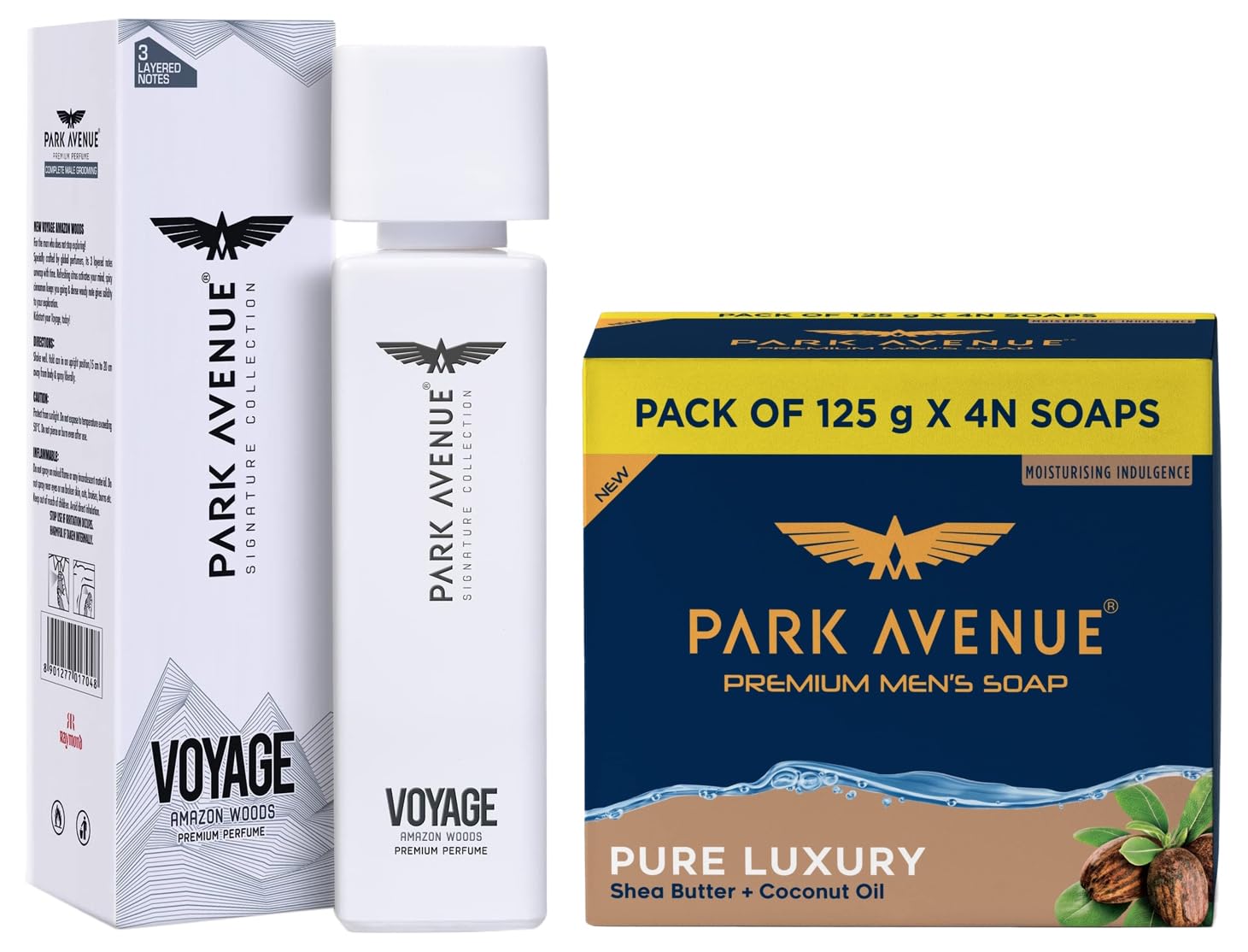 Park Avenue Voyage Amazon Woods Perfume 120mlPresenting the new voyage Amazon woods premium body spray a premium non-gas offering from the master perfumers at Park Avenue. Its best-in-class glass bottle comes in a premium carton packaging and its provides 4 times more perfume than regular aerosol sprays. Its 100% perfume liquid 0% gas leaves you feeling invigorated and smelling your best all day long. The refreshing citrus activates your mind spicy cinnamon keeps you going & dense wiidy notes gives solidity to your exploration its 3 layered notes unwrap with time So that you can kick-start your voyage today!.Park Avenue Pure Luxury Soap Pack of 4 500gmPark Avenue Luxury Soap is now fortified with rich skin conditioner that moisturises your skin and shea butter to hydrate your skin instantly.Now available in an all new avatar to match your style.Dual combination of skin conditioners which will collectively permeate tough skin & hydrate it.Original classic long-lasting masculine fragrance to uplift your mood.