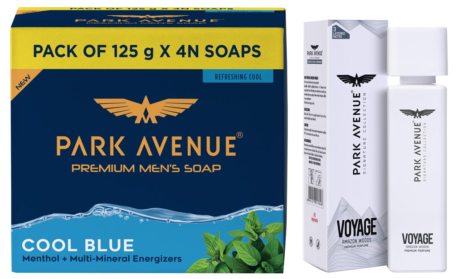 Park Avenue Voyage Amazon Woods Perfume 120mlPresenting the new voyage Amazon woods premium body spray a premium non-gas offering from the master perfumers at Park Avenue. Its best-in-class glass bottle comes in a premium carton packaging and its provides 4 times more perfume than regular aerosol sprays. Its 100% perfume liquid 0% gas leaves you feeling invigorated and smelling your best all day long. The refreshing citrus activates your mind spicy cinnamon keeps you going & dense wiidy notes gives solidity to your exploration its 3 layered notes unwrap with time So that you can kick-start your voyage today!.Park Avenue Cool Blue Soap Pack of 125 * 4 (500gm)Park Avenue Cool-blue soap keeps you cool in the scorching heat of summer. The cool effect achieved from the mint extracts and other cooling components keeps you cool and light-headed even during the tiresome sunny days. Park Avenue Cool Blue Soap contains extra cooling properties which makes you feel an exotic chillness reminding you of the poles in summer! It gives you a tingling sensation of ice that sets your pulse racing.