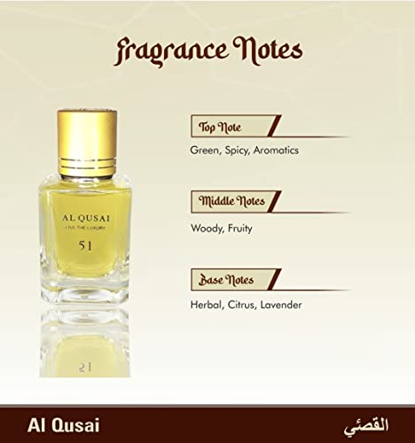 Al Qusai 51 This exotic 51 perfume by Al Qusai is a concoction of heavenly aromas gently brewed together which will transport you to the Middle East. The top notes are packed with whiff of spiciness paired with the fresh smell of citrus aromatics which provide an uplifting long lasting olfactory experience which rejuvenates your senses while maintaining the scent's royal glory. LIVE THE LUXURY with Al Qusai - 51 enrich your exterior and liven up your environment around you.