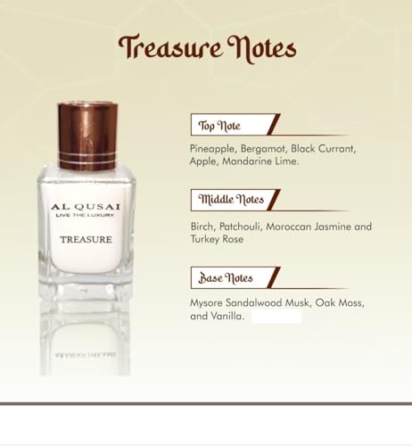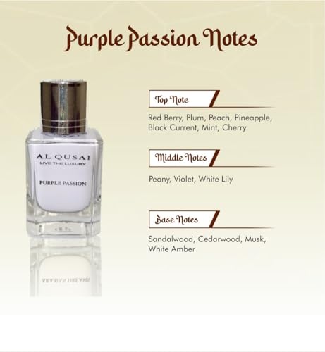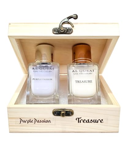 Al Qusai Purple Passion A purple concoction with fruity aromas create an enticingly sensual scent with a lingering sweetness. The top notes of berries and blossoming cherries entice you and the lily's centre notes give off a fresh floral aura. LIVE THE LUXURY with Al Qusai -Purple Passion a tantalizing scent which will craft a sophisticated aura around you and bring out your Passionate side. Al Qusai - Treasure Experience the irresistible charm of Al Qusai Treasure Parfum With an enticing blend of top notes including juicy pineapple zesty bergamot succulent black currant crisp apple and tangy mandarine lime it instantly transports you to an exotic paradise. The heart notes of birch patchouli moroccan jasmine and turkey rose add a sensual and mysterious allure Unleash your inner charm and let Live The Luxury with Al Qusai's Treasure your weapon of seduction.