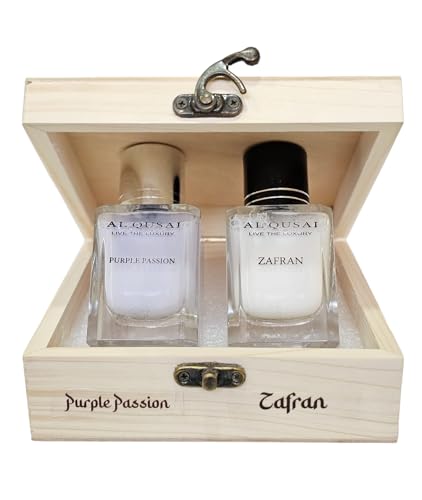 Al Qusai Purple Passion A purple concoction with fruity aromas create an enticingly sensual scent with a lingering sweetness. The top notes of berries and blossoming cherries entice you and the lily's centre notes give off a fresh floral aura. LIVE THE LUXURY with Al Qusai -Purple Passion a tantalizing scent which will craft a sophisticated aura around you and bring out your Passionate side. Al Qusai - Zafran Zafran is a divine unisex scent with saffron as top notes undertones and earthy tones of amberwood base notes include fir resin and cedar. Zafran which has a rejuvenating effect on the mind and body will create an aromatic atmosphere around you. making you stand out.LIVE THE LUXURY of Al Qusai's Zafran long-lasting_refreshing essence; you simply can't stay out of it!