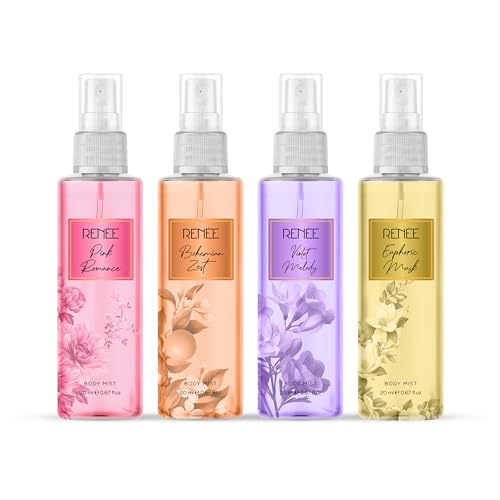 Pink Romance : Top Notes: Neroli Bergamot Red Fruits Rose Middle Notes: Raspberry Caramel Lily of the Valley Orchid Base Notes: Musk Vanilla Moss Get ready to tune into the floral melody of RENEE Pink Romance Body Mist. Crafted with heady notes of Bergamot Caramel and Vanilla; this long-lasting mist will leave you smelling like a bouquet of flowers drenched in a delicious dessert. Violet Melody : Top Notes: Sicilian bergamot Mandarin Blackcurrant liqueur. Middle Notes: Rose de mai Neroli Egyptain jasmine Freesia. Base Notes: Patchouli Woods Amber Orcanox Vanilla. Celebrate the party called life with RENEE Violet Melody Body Mist. Infused with the zesty notes of Blackcurrant Rose & Neroli; this concoction of bold and romantic fragrance will let you own the dance floor turn heads and leave a lasting impression. Euphoric Musk : Top Notes: Caraway Bitter Almond Middle Notes: Jasmine Sambac Moss Base Notes: Jacarander Wood Vanila Musk Wrap yourself into the zen-like aura of RENEE Euphoria Musk Body Mist. With each spritz you embark on a fragrant journey that transports you to a tranquil oasis where combined notes of Jasmine Moss & Musk serenade your senses. Bohemian Zest : Top Notes: Orange Blossom Middle Notes: Jasmine patchouli Base Notes: Cedarwood Rose Honey Indulge with the vibe of a free spirit with RENEE Bohemian Zest Body Mist. Created with an energizing play of Orange blossom Honey & Patchouli this mist is like dancing through a field of blooming flowers surrounded by the sweetest nectar!