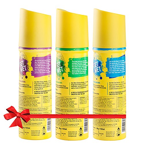 Set Wet Deodorant Spray Perfume 150ml (Cool Charm and Swag Avatar Pack of 3)Set wet an active player in the deodorants category. These new ranges of deodorants from set wet are a burst of colour energy and youthfulness. It prevent body odour caused by the bacterial breakdown of perspiration in armpits and other areas of the body. Set wet cool avatar deo: you are the king of sun and sand. The sporty one whoâs up for anything. You enter and the beach comes alive. You play ball. You pull off stunts on water. And of course are tagged in every beach selfie. Make set wet your ally. You avatar is cool avatar. Set wet charm avatar deo: you bring lovistaan alive every morning. You know what they want. And are not afraid to make the first move. Youâre 100% compatible with every sun sign. No wonder you're called the real love guru. Don your charm avatar and make this set wet fragrance your plus one. Set wet swag avatar deo: you are the ray of sunshine on a dull day. The mad energy that wakes up boring lectures. You are bright even omg sometimes. But that only makes you the class favourite. And the reason no one ever bunks class. Make set wet your seat partner. Your avatar is swag avatar.Set Wet Cool Hold Hair Gel 250 mlYou know what being cool is all about. Nothing else says that you are a cool dude more than your attitude. Life is a party for you and you just know how to rock it. Charm is your middle name and style is your ultimate game. And what better way to play the game of style than with Cool Hold Hair Styling Gel for Men. For RE-STYLABLE LOOK try the new and improved Set Wet Cool Hold men hair styling gel that gives your hair precisely the level of hold that allows you stay slick and cool the whole day. Set Wet Cool Hold Hair Styling Gel for Men is a light hold gel for fine hair that gives your hairs precisely the level of hold and allows you change your hairstyle through the day. Set Wet gel is 100 percent ALCOHOL FREE hair gel for men and contains added pro-vitamin b5 water soluble vitamin that moisturizes the hair keeping it soft strong and conditioned. Give your hair the strength they need and makes you feel more confident. Style with attitude and stay as a cool dude. Don't wait for a perfect moment style your hair with Set Wet Cool Hold Hair Styling gel for men and create a perfect moment.