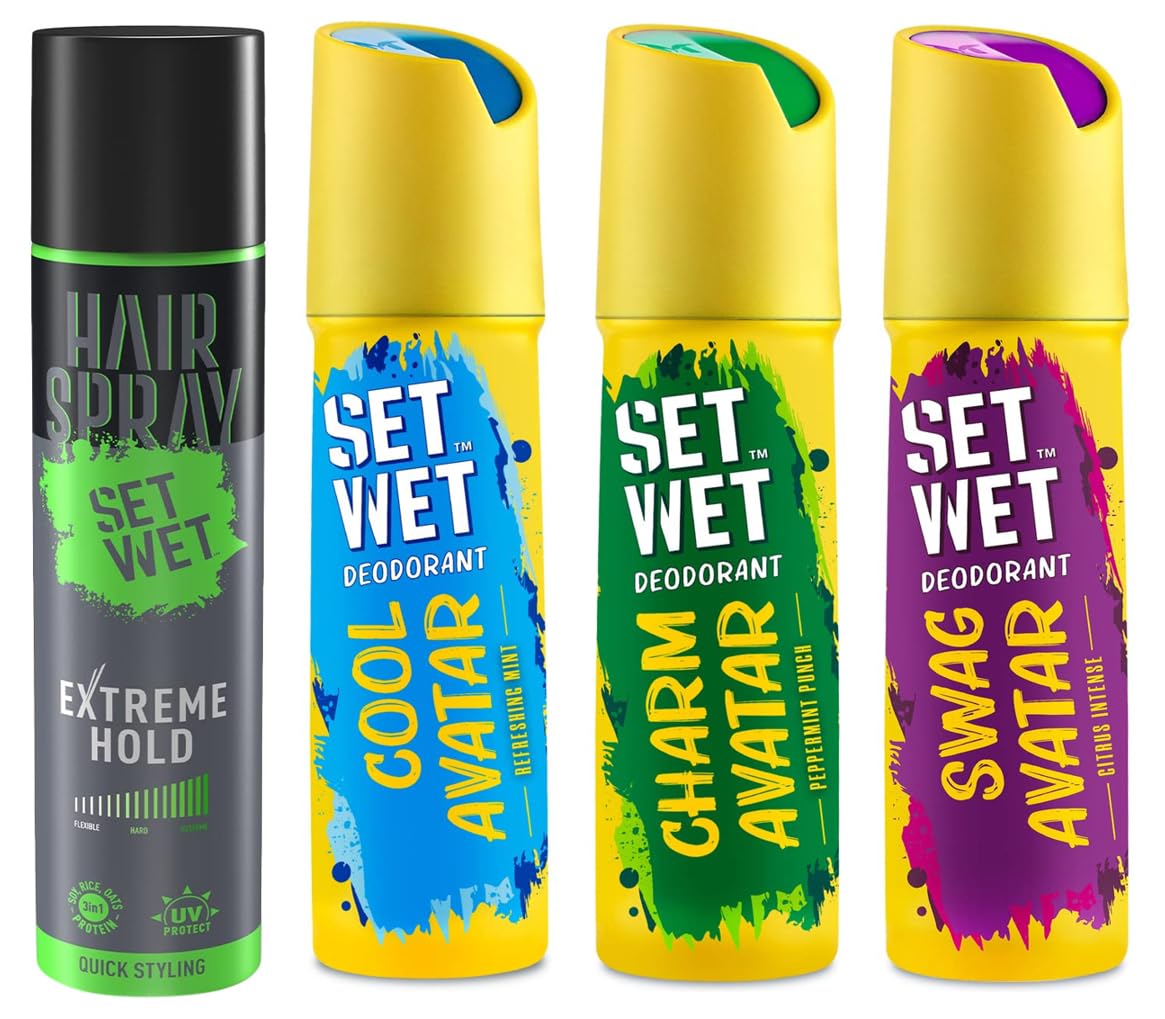SET WET Deodorant Spray Perfume Cool Charm & Swag Avatar for men 150ml (Pack of 3)Set Wet Cool Avatar deodorant for men: Feel like the king of sun and sand with the Set Wet Cool Avatar deodorant for men. This deo is hand-picked for the sporty man like you! You enter and the beach-vibe comes alive. Your personality makes others want to engage with you. You are sporty you are cool. Enjoy the breezy fragrance of Set Wet Cool Avatar menâs deo. It has a fresh breath of mint and ginger with woody under tones a whiff of musk and a long lasting trail of vetiver. Make Set Wet your coolness buddy. You avatar is Cool Avatar. Set Wet Charm Avatar deodorant for men: Switch on your charm and bring Lovistaan alive every morning! You know what they want. You are not afraid to make the first move. You are 100% compatible with every sun sign. Feel like the real love guru with Set Wet Charm Avatar menâs deodorant. This deo has an attractive musky fragrance with a whiff of lavender accents of cardamom and a trace of peppermint. Don your Charm Avatar and make this Set Wet deodorant spray perfume your plus one. Set Wet Swag Avatar deodorant for men: There is no wrong time to switch on the Swag! Be the ray of sunshine on a dull day with Set Wet Swag Avatar deodorant for men. Be the mad energy that wakes up boring lectures. Be bright. Let them go âOMG!â with your whiff of perfume. Set Wet Swag Avatar deo has a fresh fragrance with a strong note of patchouli & sandalwood a crisp citrus burst and a subtle hint of grapefruit. Make Set Wet your wingman with Set Wet Swag Avatar. Set Wet Avatar range of deodorants for men is a burst of colour energy and passion that comes with the prime of youth. It is a collection sunny sporty and charming fragrance for men that are perfectly suited to deliver to your varying avatars. Set Wet Avatar range of deo for men prevent body odour caused by the bacterial breakdown of perspiration in armpits and other areas of the body. This range of deodorant spray for men are perfect for everyday use and can be used on both body and clothes. Set Wet is a Brand with an agenda of making men feel great again by bringing back confidence in them. With its range of hair gel wax menâs deodorants body spray for men and menâs perfume Set Wet offers the idea that the way to gain admiration from peers lay in enhancing their playful sexy charming side. The brand partners him in showcasing the very best of him with a simple motto: 'Itâs Not Sexy Till You Show It' or as we say 'Sada Sexy Raho'.Set Wet Hair Spray for Men Extreme Hold 200ml | No Sulphate No Paraben | Quick Hair Styling and Setting No FlakingThe Set Wet Hair Spray for men-Extreme Hold sets your hairstyle so that no strand is out of place. Just spray the Set Wet Extreme Hold Hair Spray and look sada sexy. This Set Wet Extreme Hold Hair Spray for men is non-sticky and sets your hair in place without weighing it down. When used after styling with gel wax clay or pomade the Set Wet Extreme Hold Hair Spray gives an extra strong hold to maintain your hairstyle all day long. The Set Wet Extreme Hold Hair Spray contains only sexiness & no harmful chemicals that harm your hair. Free of all baddies like paraben sulphate mineral oil petrolatum formaldehyde DEA SLS and SLES. Style your hair then spray it on before you head out for a date a chill Friday evening a dinner date or even a dance party. It's all you need to keep your confidence high and sexy. This Set Wet Extreme Hold Hair Spray can be easily combed or washed off without the need of a shampoo and is ideal for men with straight wavy or curly hair.