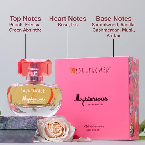 Soulflower Mysterious Women: Delve into an elegant blend of red rose blue iris and sandalwood enriched with 16% essential oils for a lingering fragrance of sophistication and allure. Vegan cruelty-free and ethically crafted.